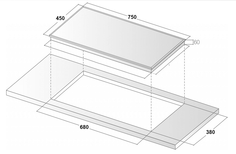 + Kích thước khoét đá: 680 x 380 mm