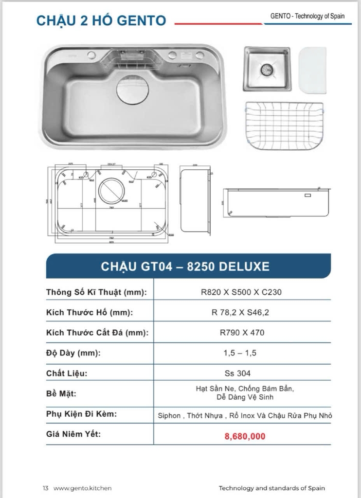 Chậu rửa bát Gento GT04-8250 Deluxe sẽ là người bạn đồng hành thân thiết với căn bếp của bạn.