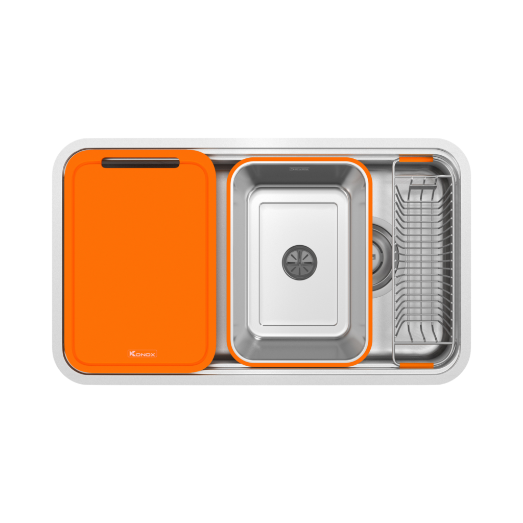 Tích hợp phụ kiện đáp ứng đủ tiêu chí sử dụng hàng ngày của người nội trợ: thớt nhựa cam, colander và rổ phụ.