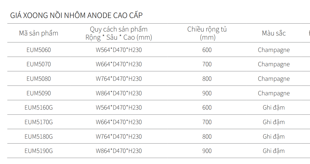 Giá xoong nồi tủ dưới Eurogold hộp nhôm Anode có 2 màu: ghi đậmEUM và vàng gold. Mỗi màu có 4 size như bảng bên dưới