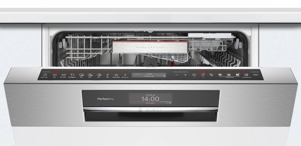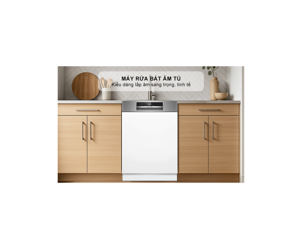 Máy rửa bát Bosch SMI8ZDS81T serie 8 được thiết kế theo kiểu dáng bán âm (Semi-integrated), một lựa chọn hoàn hảo cho những ai yêu thích sự đồng bộ trong nội thất. Phần cửa máy cho phép lắp đặt một tấm gỗ trang trí cùng loại với tủ bếp, tạo ra một không gian liền mạch và thống nhất, trong khi vẫn giữ lại màn hình hiển thị mặt trước máy để tiện theo dõi.