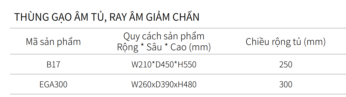 - Tích hợp ray giảm chấn dễ dàng kéo thùng ra và lấy gạo mỗi ngày. Ray chịu được tải trọng cao nên không lo sức nặng của thùng làm cong vênh, gây khó khăn trong quá trình sử dụng.